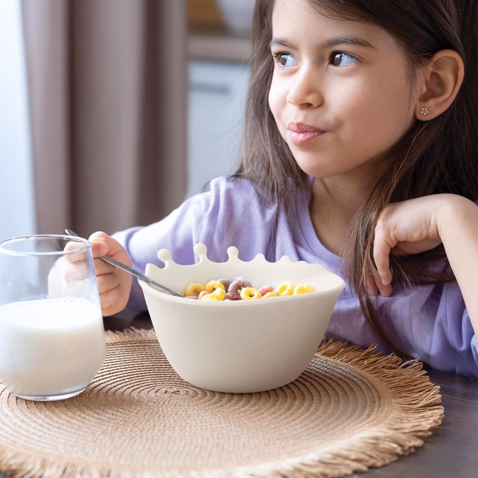 A soft silicone cereal bowl shaped to look like milk mid-splash.