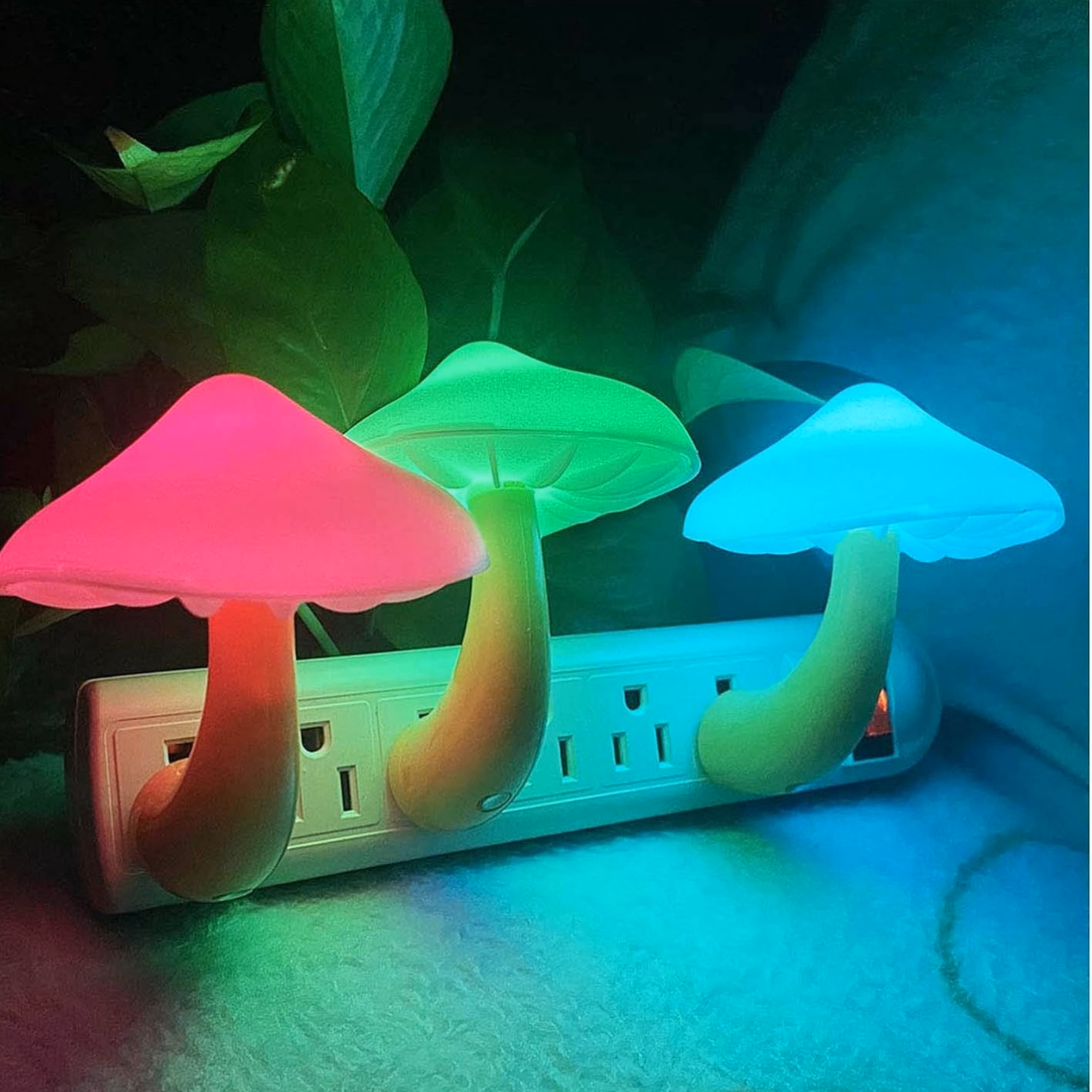 Soft-glowing mushroom night lights that turn on automatically at dusk.