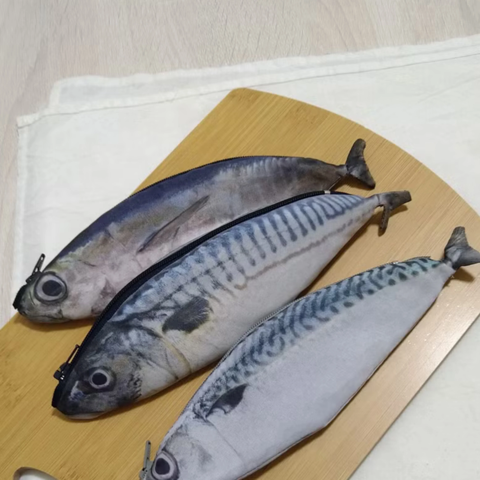 A zippered pouch shaped like a mackerel, sized for small everyday things.