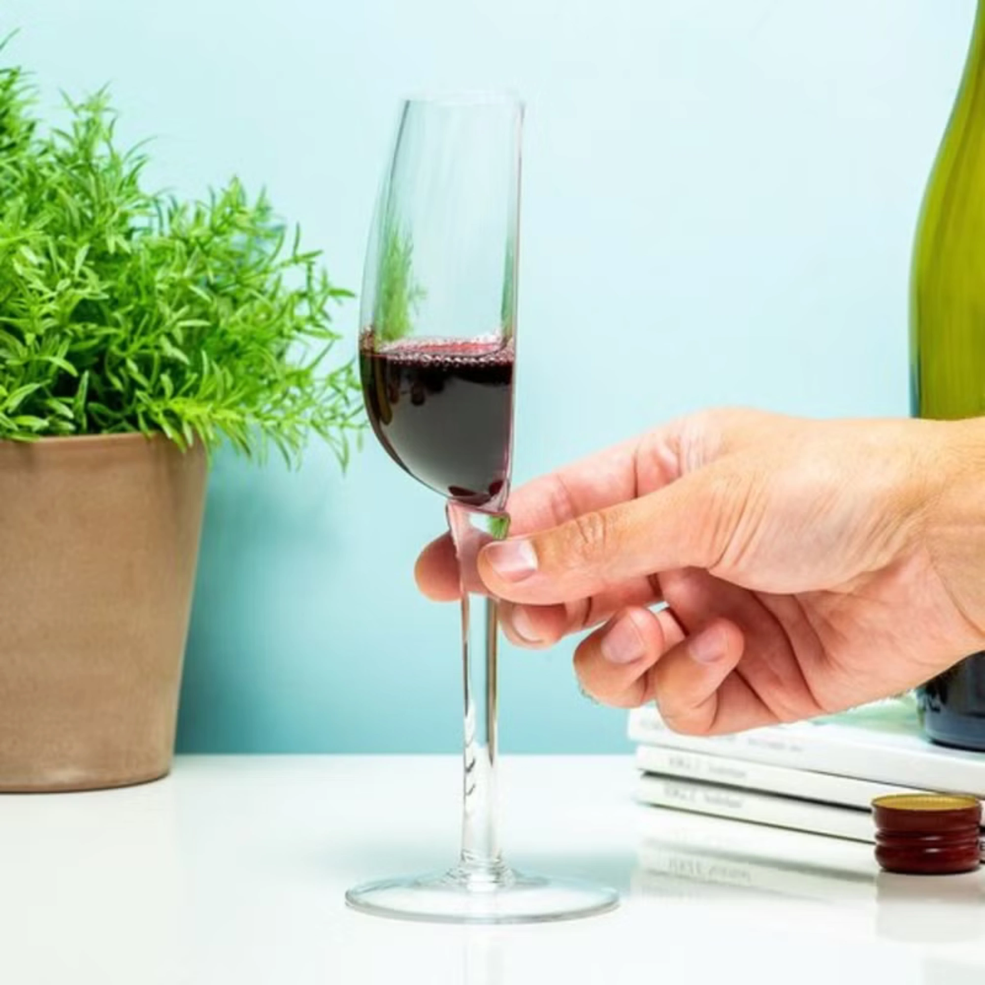 A wine glass designed to look permanently half full.