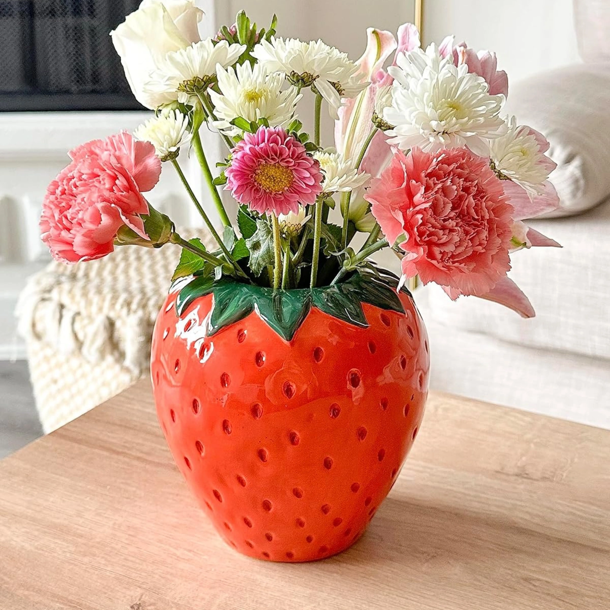 A ceramic vase shaped like a strawberry, for flowers or just visual confusion.