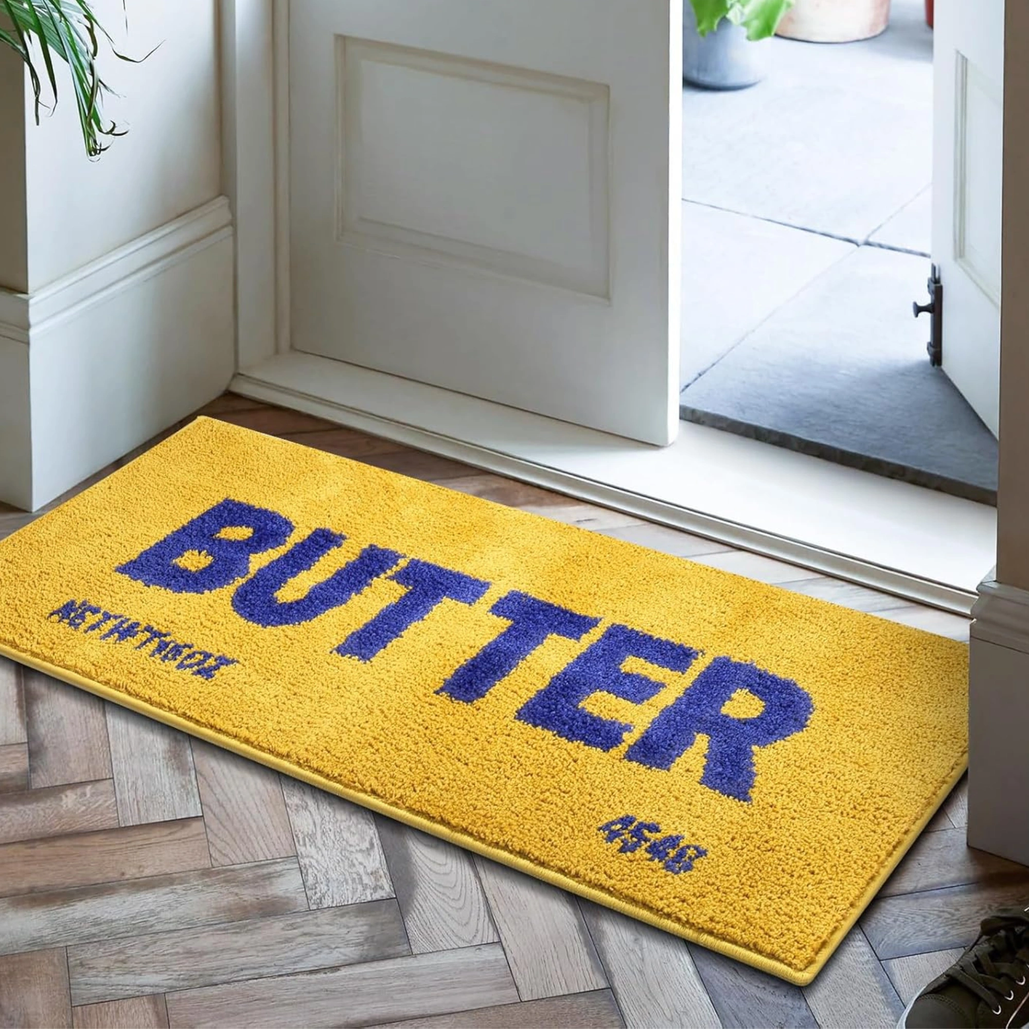 A soft floor rug designed to look like butter, placed exactly where butter should not be.