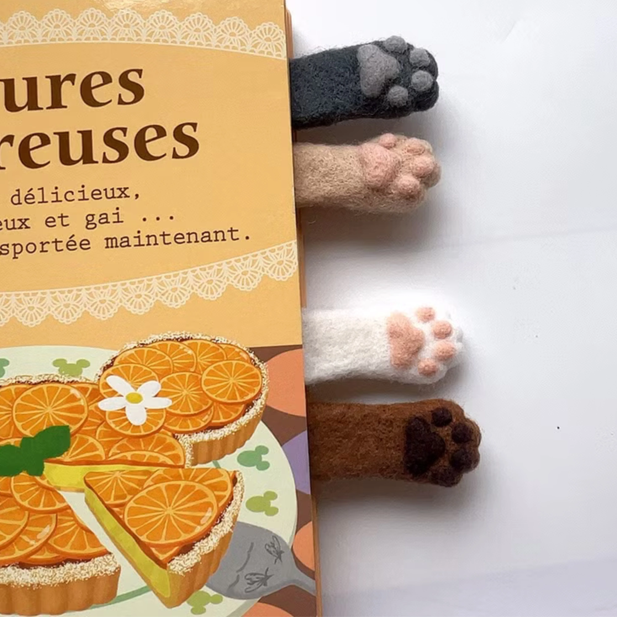 Magnetic bookmarks shaped like small cat paws peeking from the page.