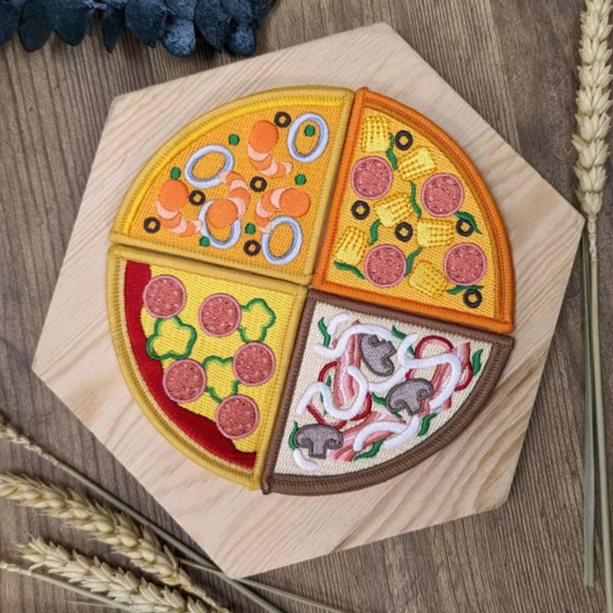 An embroidered page corner that looks like a slice of pizza.