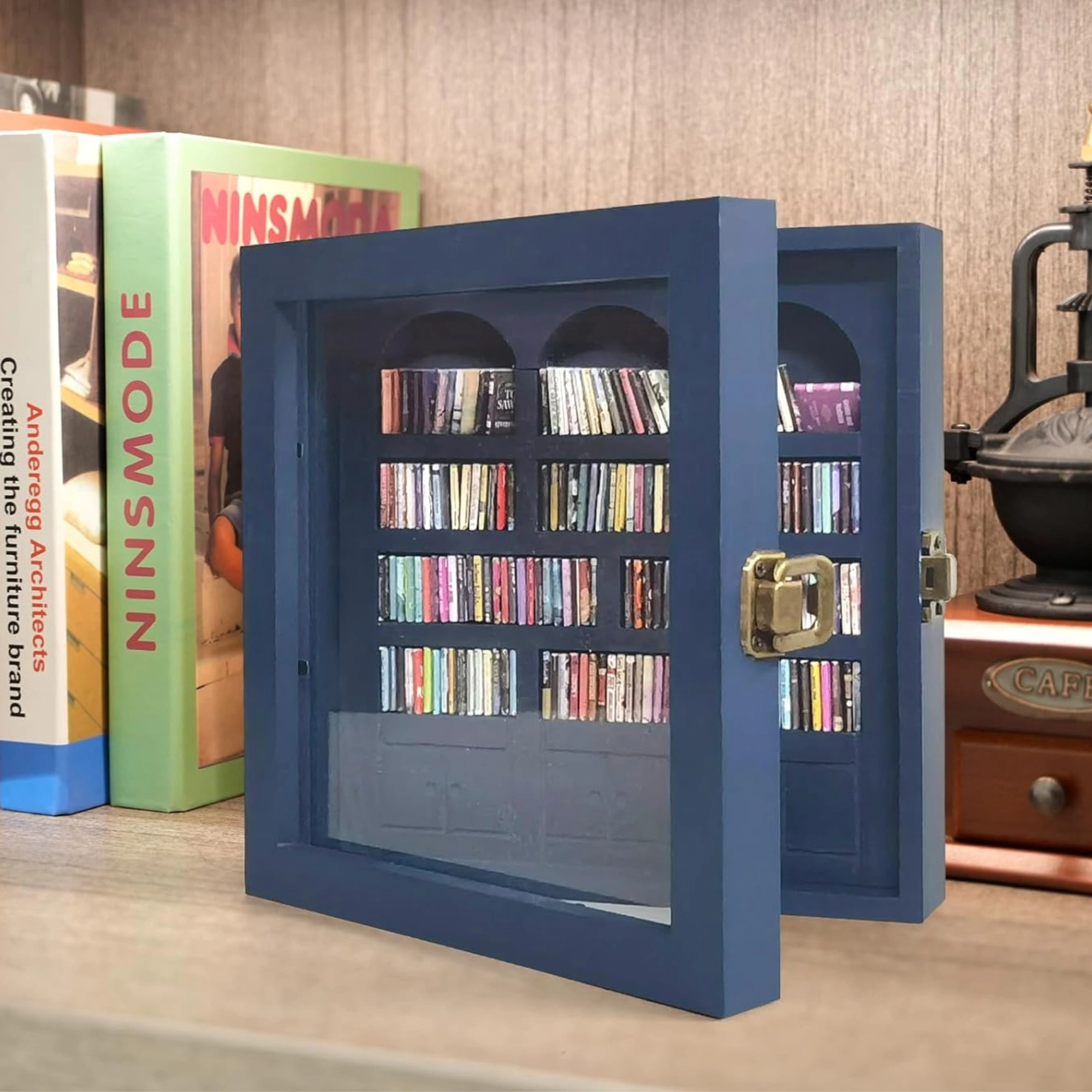 A small shelf filled with tiny books meant to be rearranged repeatedly.