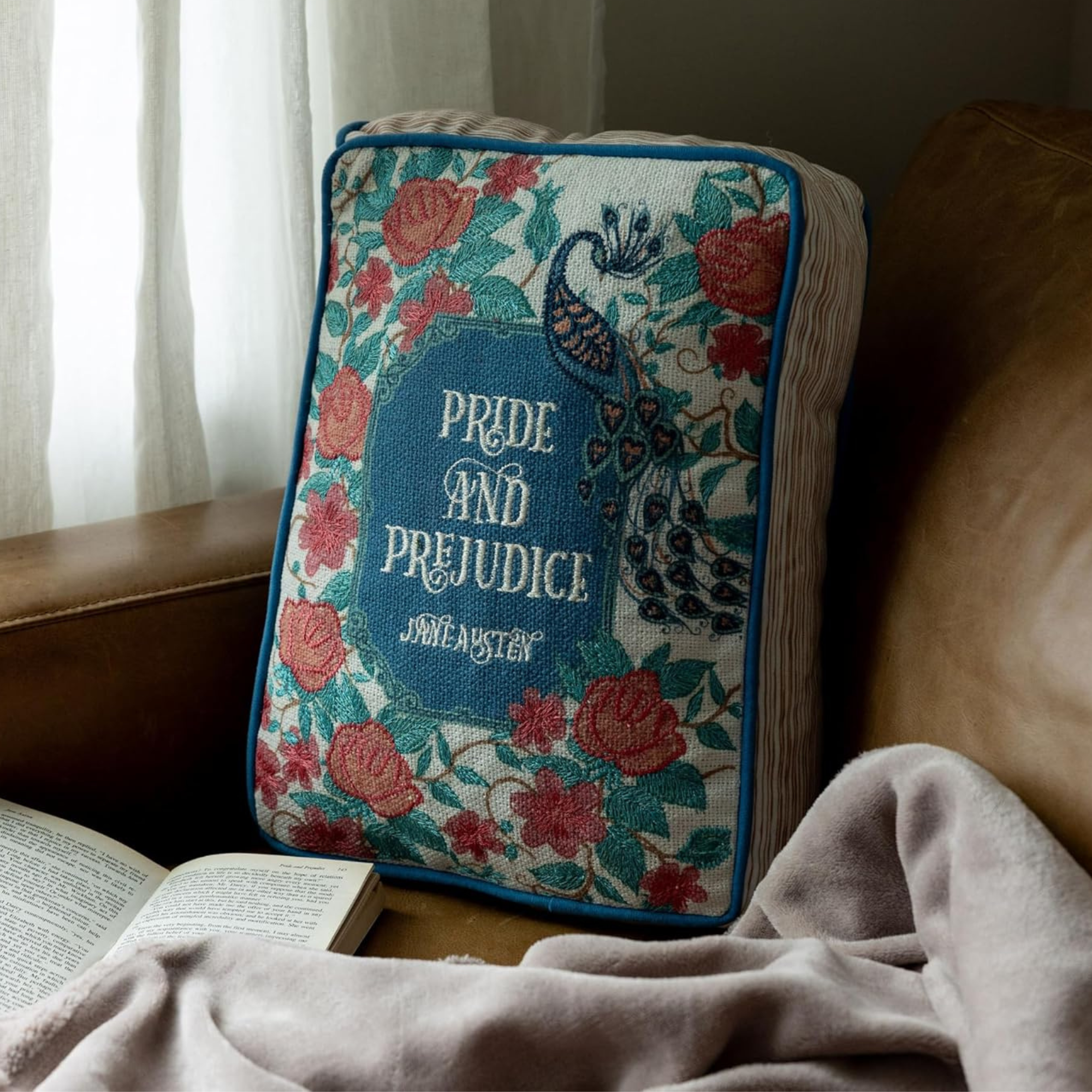 A throw pillow shaped like a hardcover book, designed to sit among real ones.